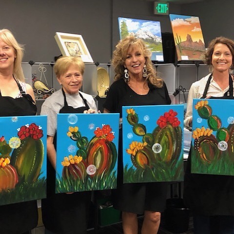 Soon the wine kicks in and jokes about giving each other the  painting for Christmas and other such shenanigans ensue.We are amazed at the different versions we have created and notice someone (far right bottom row) paints it perfectly (DEBBIE) complete with glitter. Next step, sign our masterpieces with  sharpie and go  home.  Well ONE of us in the picture below (hint, the one with big earrings) looks a little TOO happy.  (Wine remember?)